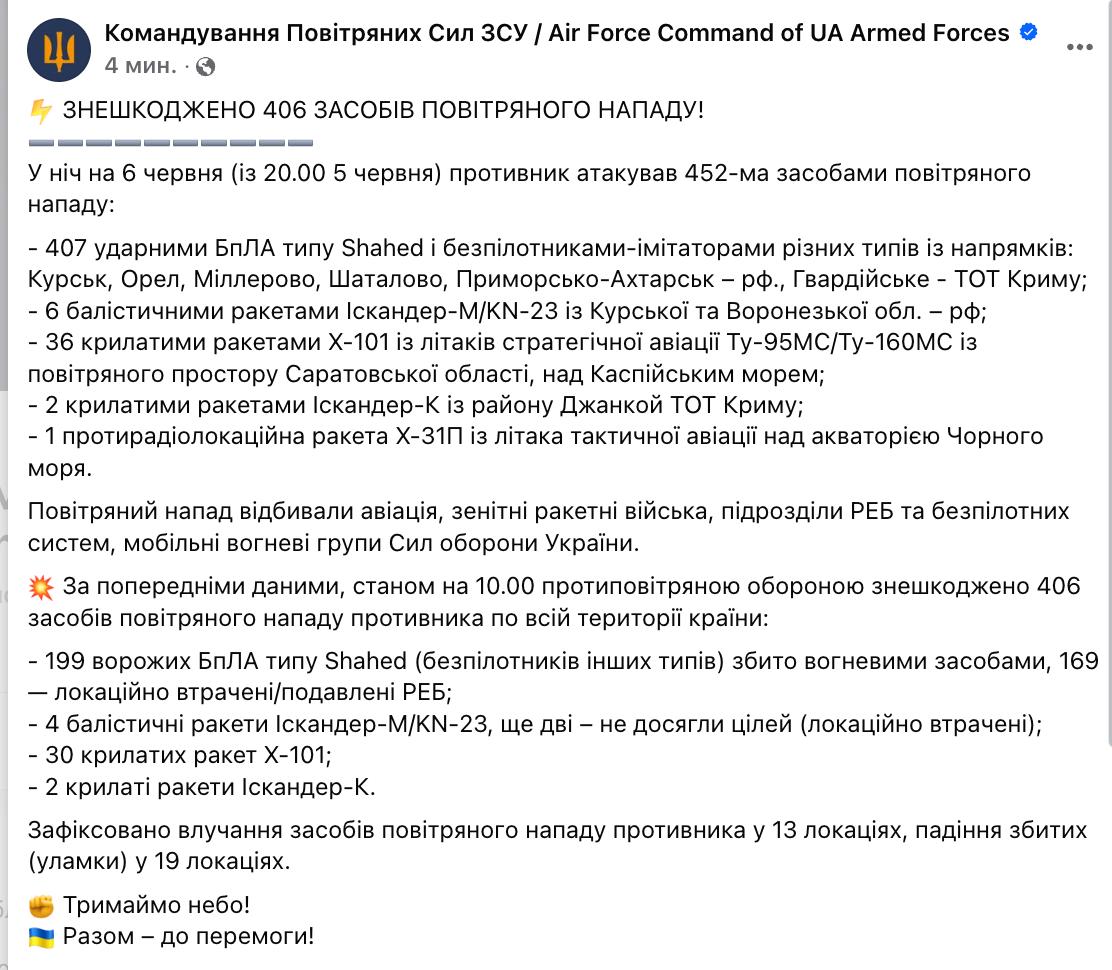 Сьогодні вночі росіяни атакували Україну 452 засобами повітряного нападу. Серед них, 407 безпілотників, шість балістичних ракет Іскандер-М/KN-23, 36 крилатих ракет Х-101, дві крилаті ракети Іскандер-К та одна протирадіолокаційна ракета Х-31П.