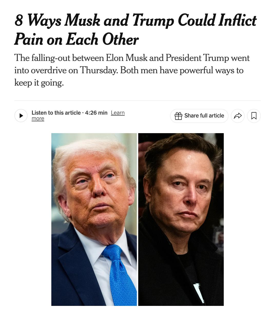 У відповідь NYT перераховує потенційні кроки, які може зробити Трамп: розрив контрактів з компаніями Маска, позбавлення його допуску до секретної інформації, тиск через Міністерство юстиції, зокрема можливе розслідування його імміграційного статусу та вживання наркотиків.