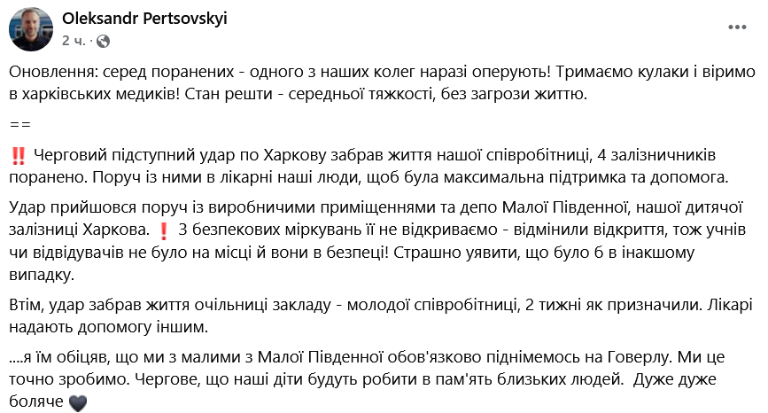 У свою чергу голова правління "Укрзалізниці" Олександр Перцовський на своїй сторінці у Фейсбуці повідомив, що жінка, яка загинула при ударі, була головою дитячої залізниці, її призначили на посаду два тижні тому.