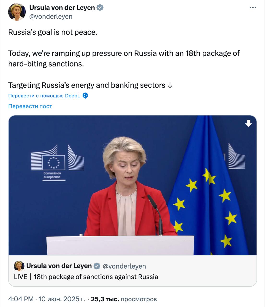 "Словацька Республіка не підтримає майбутній 18-й санкційний пакет проти РФ, якщо Єврокомісія не надасть їй реального вирішення кризової ситуації, в яку потрапить Словаччина після повного припинення постачання газу, нафти та ядерного палива з Росії", - написав Фіцо.