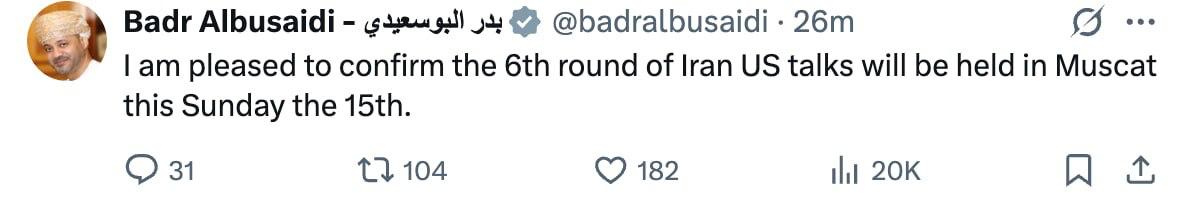 "Я радий підтвердити, що шостий раунд ірано-американських переговорів організують у Маскаті цієї неділі, 15 червня", - написав він у соцмережі X.