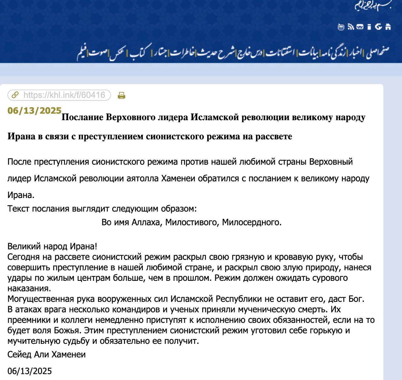 Духовний лідер Ірану аятола Алі Хаменеї своєю чергою пригрозив Ізраїлю "суворим покаранням" та "гіркою, болісною долею" за нічні удари та загибель частини іранського керівництва.