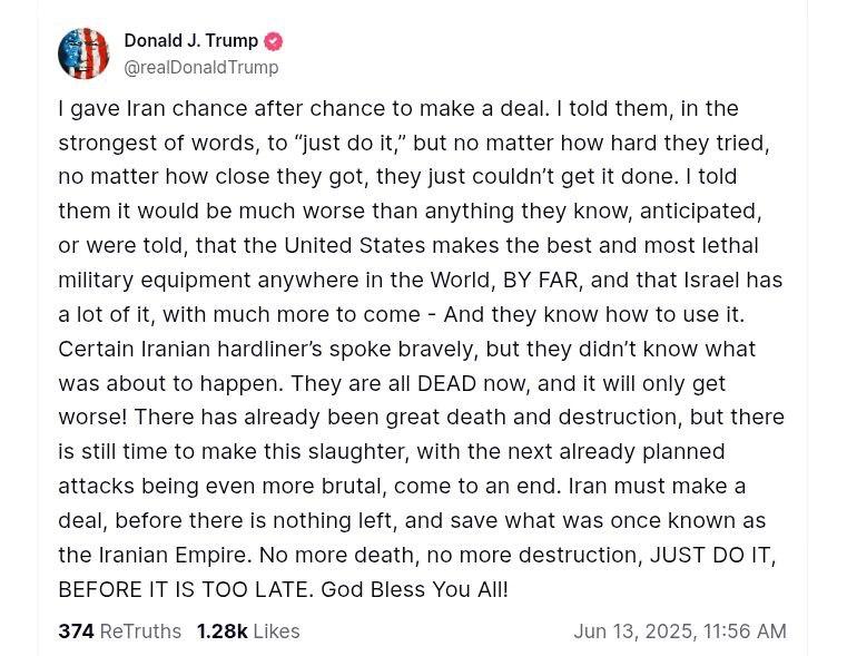 Іран повинен укласти угоду, поки що є що рятувати від того, що колись називалося Іранською імперією. Більше ніяких смертей, більше ніяких руйнувань – просто зробіть це, доки не стало надто пізно. Нехай благословить вас Бог!” – написав президент США.