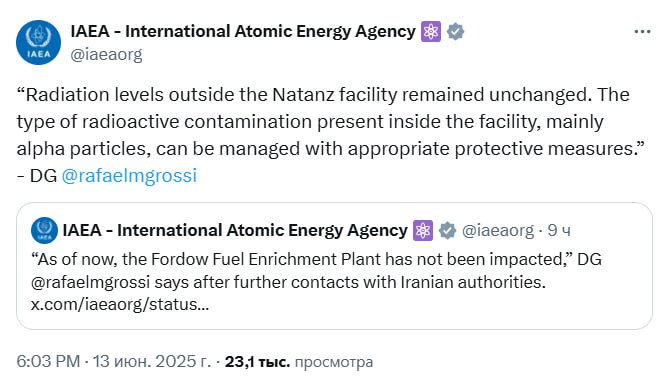 Вдень у МАГАТЕ заявили, що поки що не бачать ознак того, що удари Ізраїлю зуміли вразити ядерні об'єкти Ірану, які знаходяться глибоко під землею.