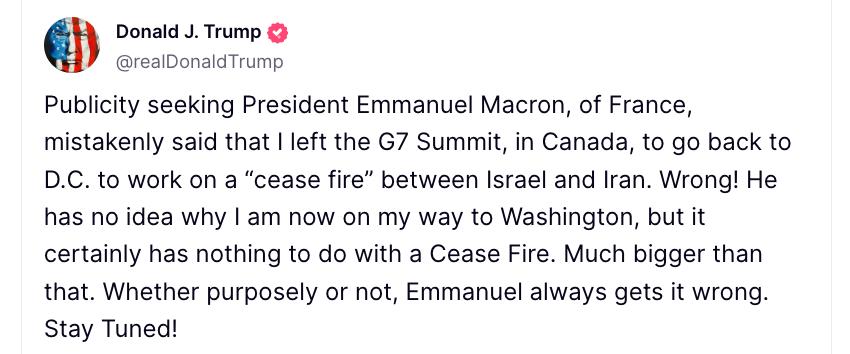 "Спрагливий публічності Макрон помилково заявив, що я залишив саміт G7 в Канаді, щоб повернутися до Вашингтона і працювати над "припиненням вогню" між Ізраїлем та Іраном. Неправда! Він уявлення не має, чому я зараз прямую до Вашингтона, але це вже точно не пов'язане з припиненням вогню. Емманюель завжди все плутає. Слідкуйте за новинами!” – написав Трамп.