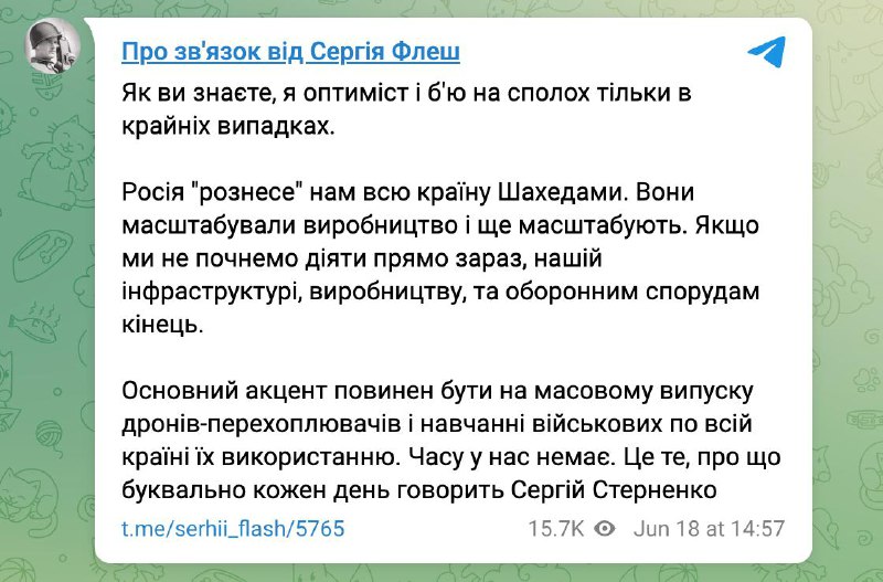 "Як ви знаєте, я оптиміст і б'ю на сполох тільки в крайніх випадках. Росія рознесе нам всю країну "Шахедами". Вони масштабували виробництво і ще масштабують. Якщо ми не почнемо діяти прямо зараз, нашій інфраструктурі, виробництву та оборонним спорудам кінець. Основний акцент повинен бути на масовому на масовому випуску дронів-перехоплювачів та навчанні військових по всій країні їх використанню. Часу в нас немає", - вважає Бескрестнов.