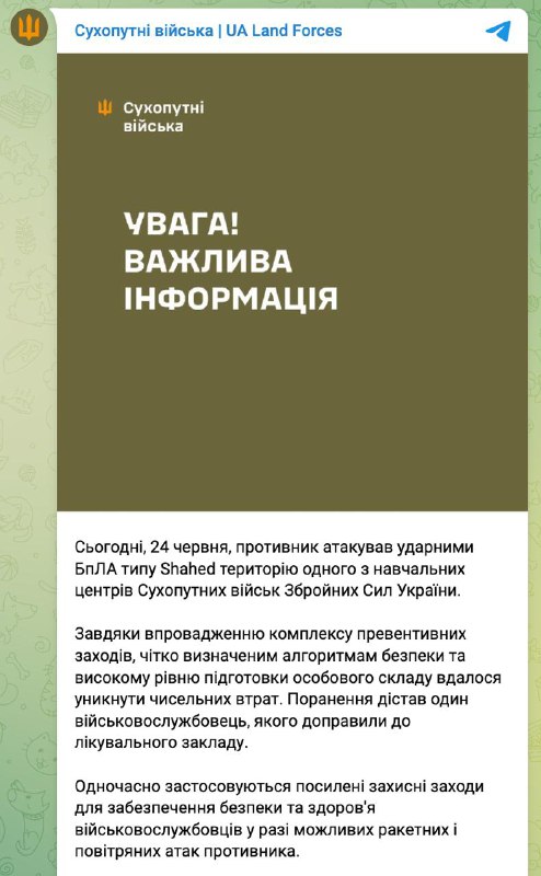 13:02 Сухопутні війська повідомляють, що сьогодні "Шахеди" вдарили по навчальному центру ЗСУ.