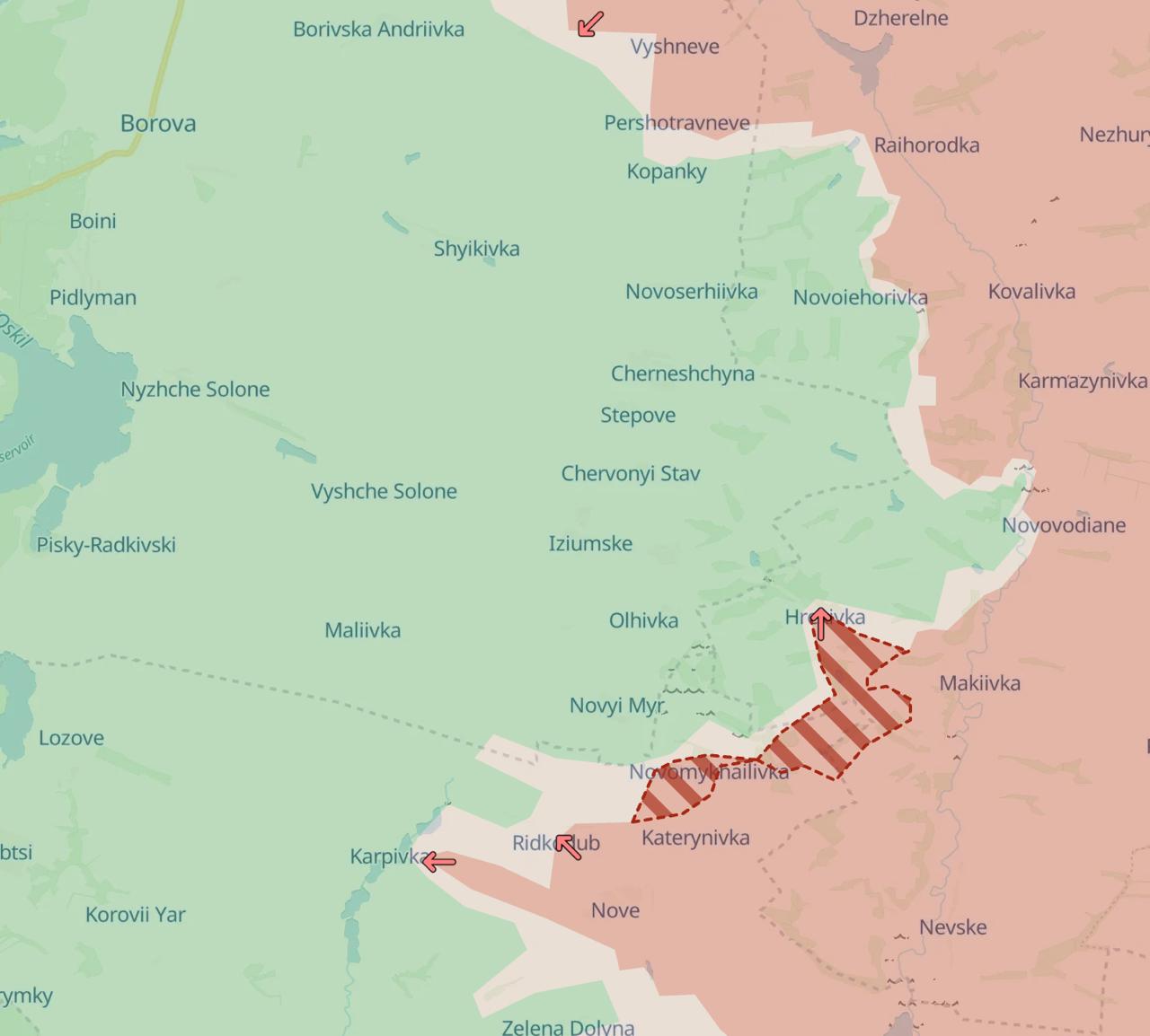 08:51 Російські війська просунулися у напрямку Борової - по лінії Новомихайлівки (захоплена), Радківки та Греківки. Про це повідомляє військовий паблік Deep State.