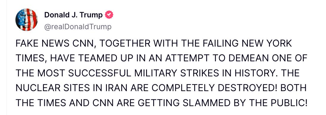 "Фейкові новини CNN разом із перебуваючої в занепадi New York Times об'єдналися, намагаючись принизити одну з найуспішніших військових операцій в історії. Ядерні об'єкти в Ірані повністю знищені. І Times, і CNN отримують шквал критики від громадськості", - написав президент США у своїй соцмережі Truth Social.