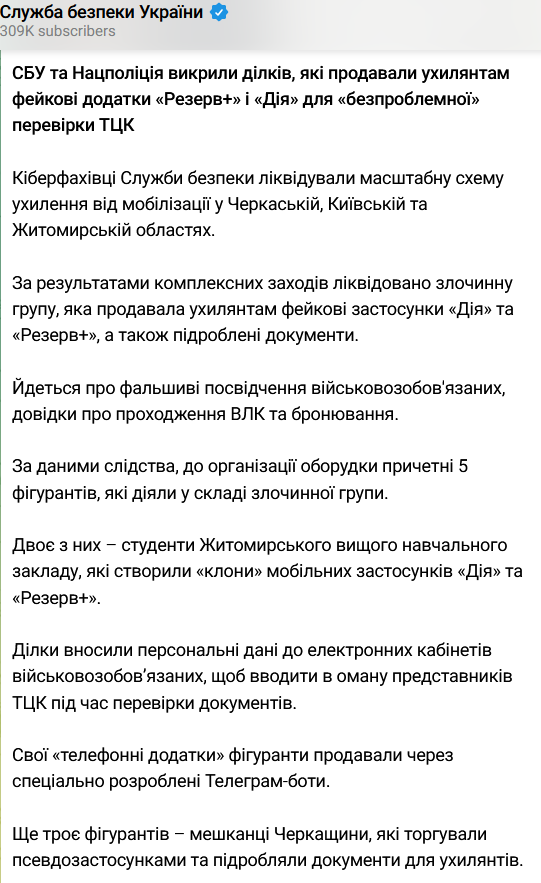 За інформацією СБУ, двоє студентів житомирського вишу створили "клони" мобільних додатків "Дія" та "Резерв+", а троє мешканців Черкаської області організували їх продаж бажаючим у столиці, а також у Черкаській, Київській та Житомирській областях.