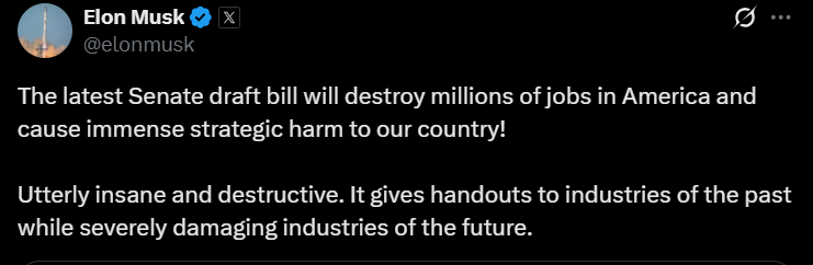 "Останній законопроєкт Сенату знищить мільйони робочих місць в Америці і завдасть величезної стратегічної шкоди нашій країні!" - написав Маск у X.
