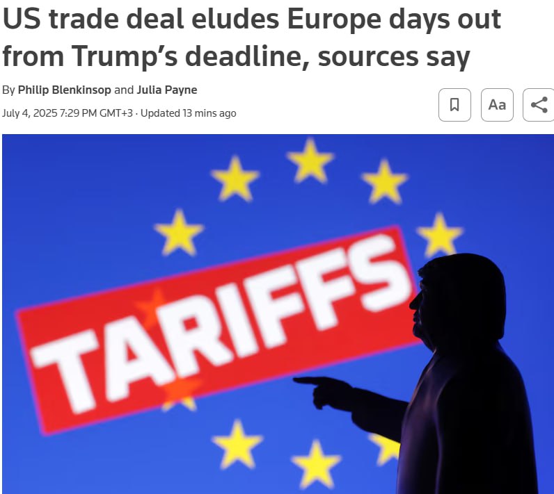 Агентство додає, що Брюссель вже відмовився від надій на укладення всеосяжної торгової угоди до крайнього терміну, встановленого Трампом 9 липня, але після переговорів у Вашингтоні неясно, чи вдасться йому взагалі укласти м'якшу угоду в принципі.