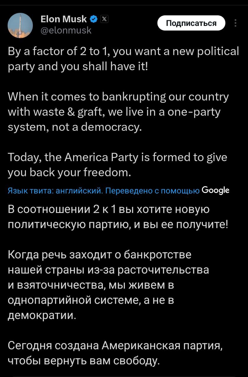 Сьогодні створено Американську партію, щоб повернути вам свободу", - написав Маск.