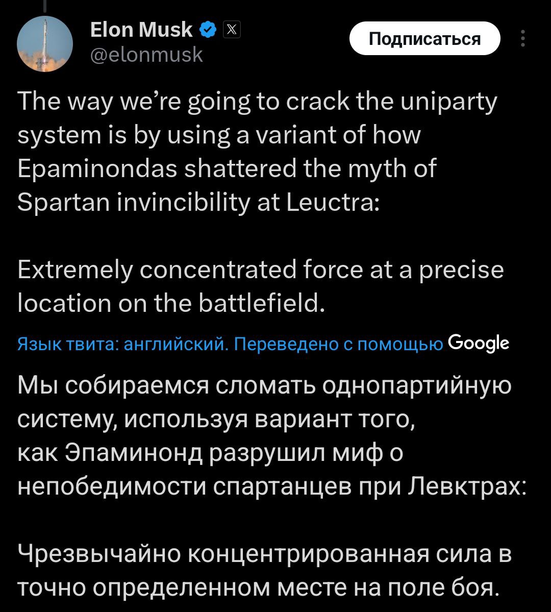 "Ми збираємося зламати однопартійну систему, використовуючи варіант того, як Епамінонд зруйнував міф про непереможність спартанців при Левктрах", - написав Маск, посилаючись на давньогрецьку тактику зосередженого удару.