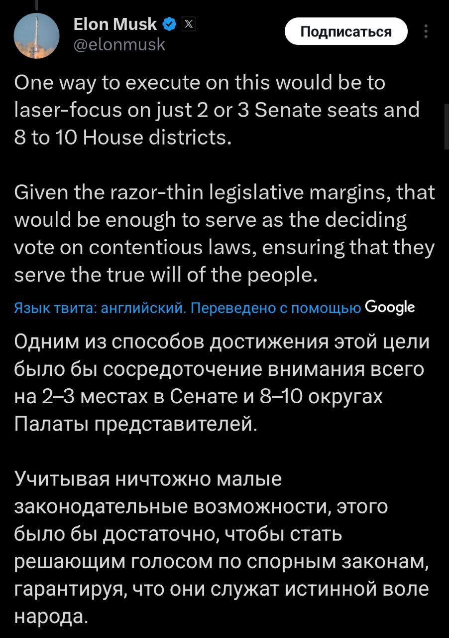 Таку тактику Маск пропонує застосувати і в американській політиці - зосередити зусилля не на масштабній виборчій кампанії по всій країні, а "на 2-3 місцях у Сенаті та 8-10 округах Палати представників".