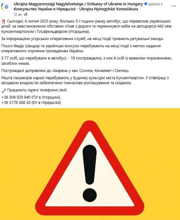 Угорська поліція заявляє, що ДТП сталася 6 липня близько 5-ї ранку недалеко від Кундялуша, між містами Кунсентмартон і Тісафельдвар.
