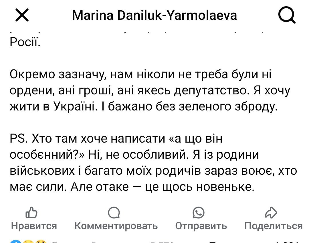 "В останні роки він позаштатно виконував проєкти для ГУР на території ворога. Причому дуже успішно - можливо, зараз проєкту буде кінець, але я точно знаю, що він віддавав йому всю душу та вміння", - пише дівчина.