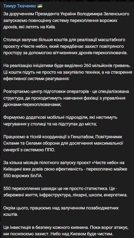 Проєкт має назву "Чисте небо", на нього витратить 260 мільйонів гривень. Він уже працює кілька місяців у пілотному режимі та перехопив під 550 "Шахедів".