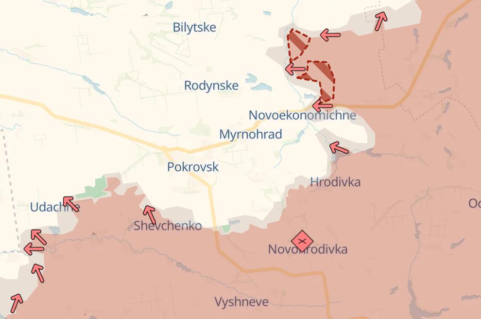 Велике просування РФ на північний схід від Покровська і Мирнограда (по лінії Новоторецьке - Новоекономічне) - з ймовірною спробою вийти на північ від Покровська.