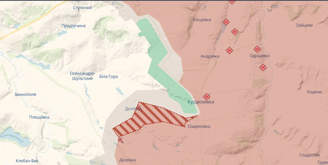 Також армія РФ настає біля Торецька, Диліївки (на північний захід від Покровська) та Красного Першого (на північ від Куп'янська).