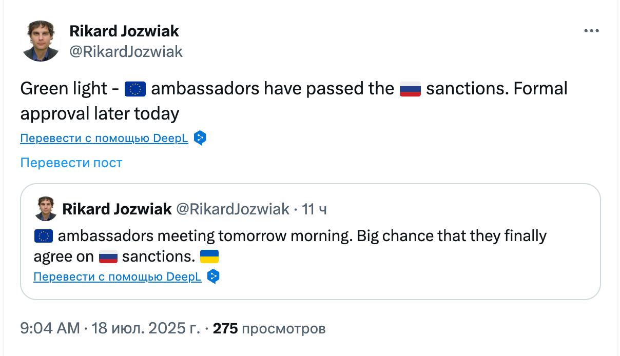 Сьогодні, 18 липня, посли Європейського союзу схвалили 18-й пакет санкцій проти РФ. Про це повідомляє кореспондент "Радіо Свобода" Рікард Йозвяк у Х.