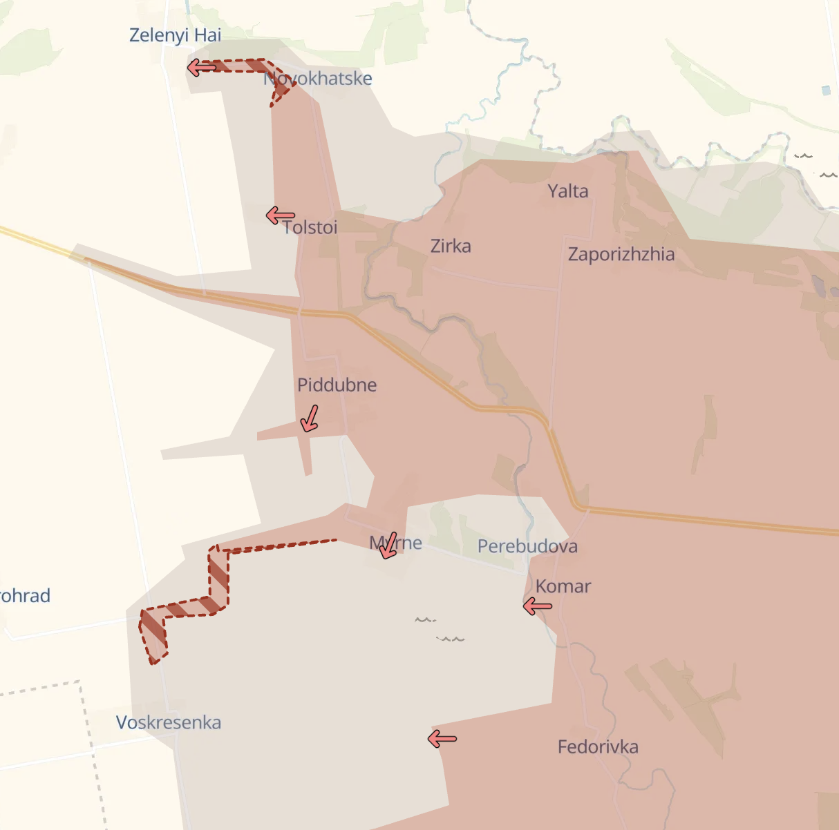 Армія РФ наблизилася до кордону Дніпропетровської області ще на двох дільницях, повідомляє Deep State. Росіяни різко просунулися з Мирного до Воскресенки, а також зайшли до Зеленого Гаю.
