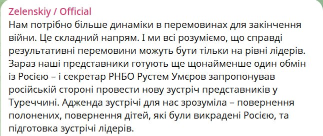 "Нам потрібно більше динаміки в переговорах для закінчення війни. Це складний напрямок. І ми всі розуміємо, що дійсно результативні переговори можуть бути лише на рівні лідерів. Зараз наші представники готують ще, щонайменше, один обмін з Росією - і секретар РНБО Рустем Умеров запропонував російській стороні провести нову зустріч представників у Туреччині. були викрадені Росією, і підготовка зустрічі лідерів” – написав Зеленський.