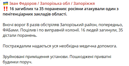 Сьогодні вночі росіяни вдарили по виправній колонії у Запорізькій області. Внаслідок обстрілу загинули 16 людей, ще 35 отримали поранення.