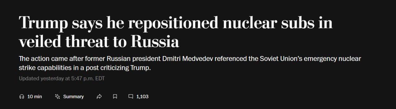 Докладніше про те, що означають заяви Трампа про передислокацію атомних підводних човнів і які можуть бути їхні наслідки , ми аналізували в окремому матеріалі.