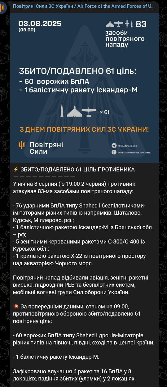 • "Шахедів" та дронів-імітаторів - 76 (збито/придушено 60);