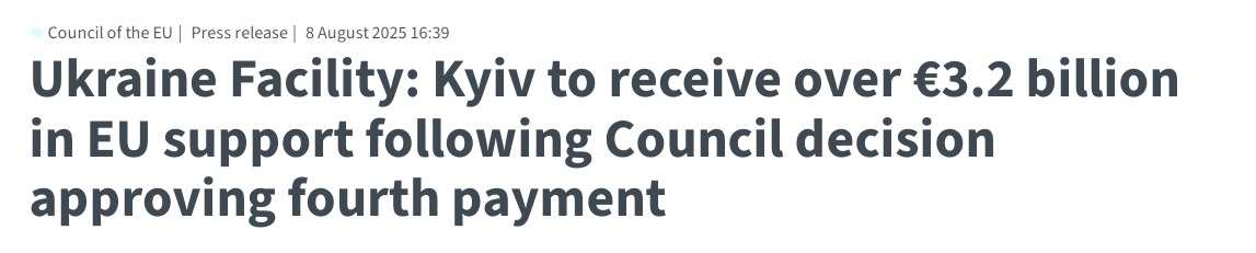 "Україна отримає фінансування у розмірі понад 3,2 мільярда євро після того, як Рада ухвалила рішення про четвертий черговий транш підтримки в рамках програми ЄС Ukraine Facility. Це фінансування спрямоване насамперед на зміцнення макрофінансової стабільності України та підтримку функціонування її органів державного управління", - сказано в повідомленні.