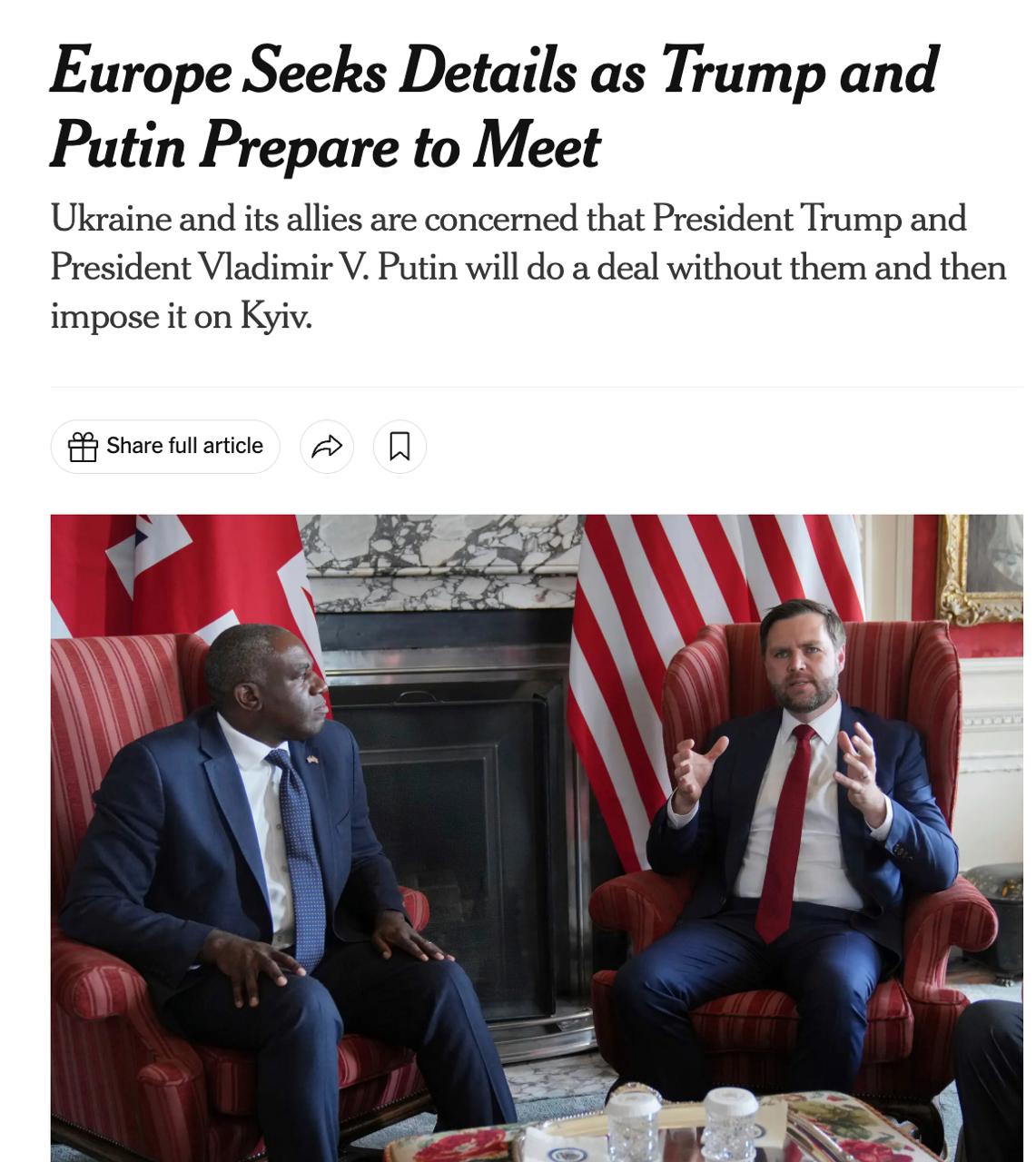 У той же час, як пише The New York Times, аналізуючи сьогоднішню зустріч у Лондоні, де представники Європи ведуть переговори зі Штатами напередодні зустрічі Трампа та Путіна 15 серпня, європейці стурбовані тим, що президенти США та РФ самі дійдуть згоди, яку потім спробують нав'язати Україні.