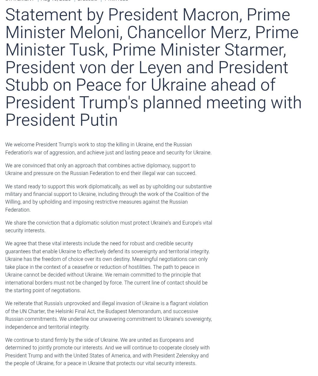 Лідери Франції, Італії, Німеччини, Польщі, Великобританії та Фінляндії, а також Єврокомісії зробили офіційну заяву напередодні переговорів Володимира Путіна та президента США Дональда Трампа.