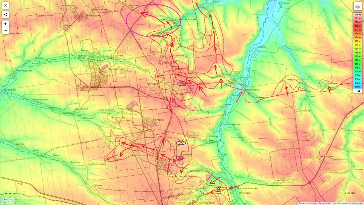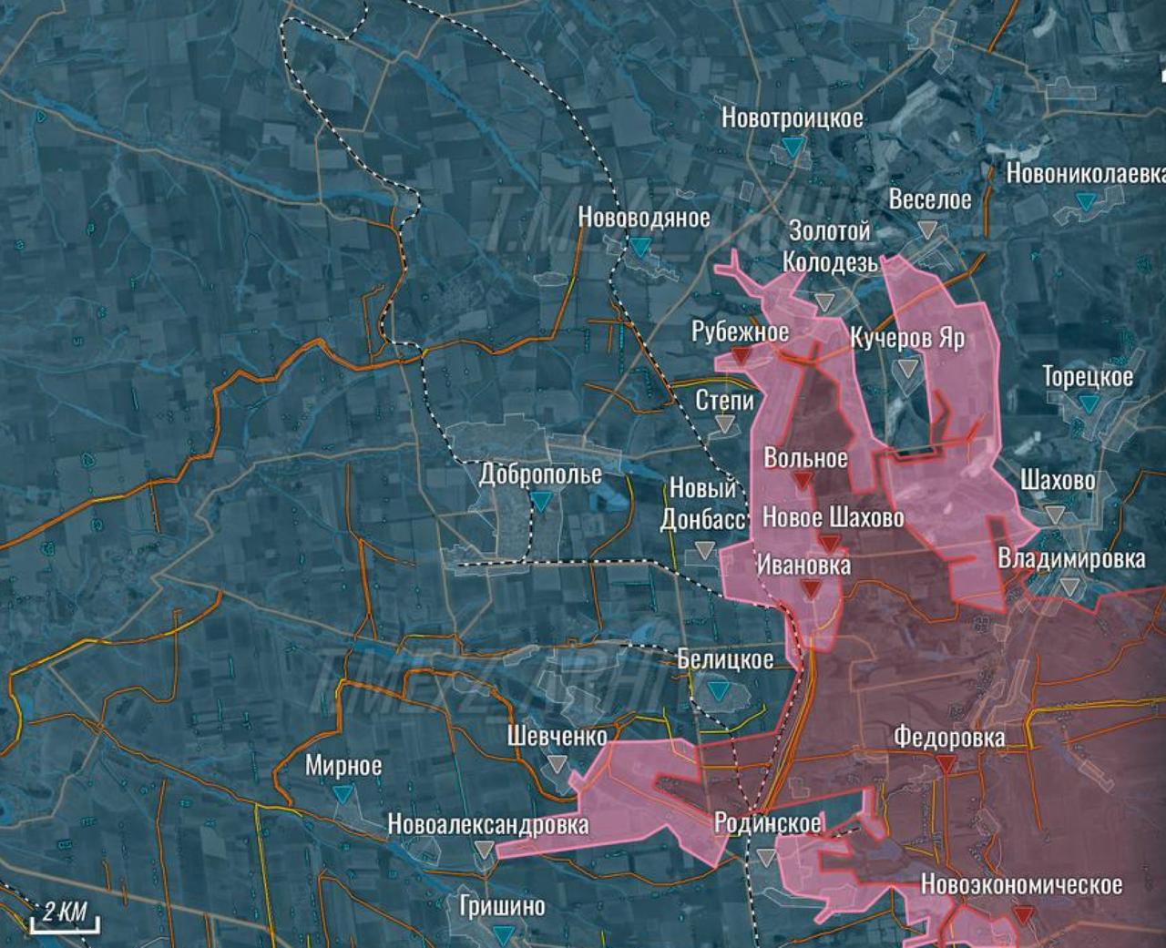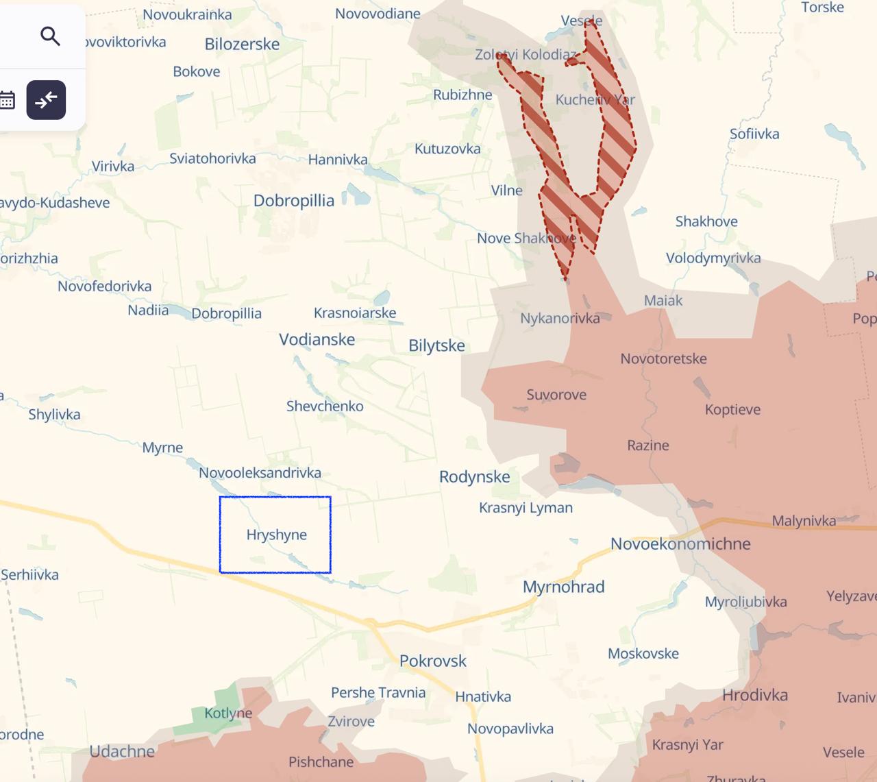 Російські паблики стверджують, що такий прорив вже відбувається, і що війська РФ, наступаючи з боку Родинського, дійшли до Гришина на північний захід від Покровська, що означало б майже повне оточення міста (див. 3 і 4 карти). Але Україна прориву до Гришина не підтверджувала. На карті Deep State цей населений пункт знаходиться в тилу ЗСУ.