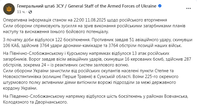 "На Північно-Слобожанському і Курському напрямках відбулося 13 атак російських загарбників. Ворог завдав вісім авіаційних ударів, скинувши 16 керованих бомб, здійснив 287 обстрілів, зокрема 24 – із реактивних систем залпового вогню. Сили оборони України зачистили від російських окупантів населені пункти Степне та Новокостянтинівка (колишнє Перше Травня) в Сумській області. Воїни 225-го окремого штурмового полку активними діями витіснили ворожі підрозділи за межі державного кордону України", - йдеться у зведенні.