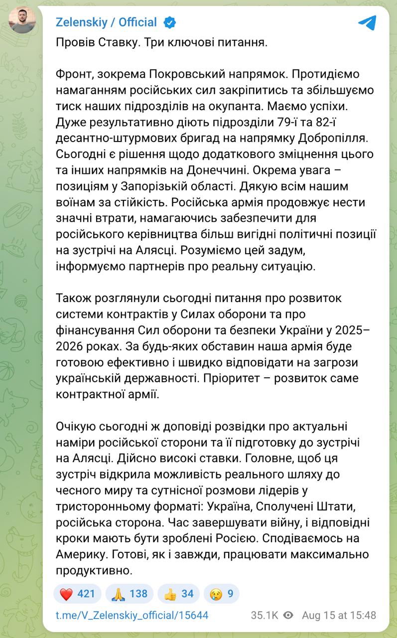 Сьогодні він також очікує на доповідь української розвідки "про актуальні наміри російської сторони та її підготовку до зустрічі на Алясці". Зеленський погоджується з Дональдом Трапом та Кирилом Дмитрієвим у тому, що "ставки високі". ("Високі ставки!" - цю фразу Трамп написав у своїй соцмережі напередодні зустрічі з Володимиром Путіним, а Дмитрієв прокоментував пост одним словом: "Правда".)