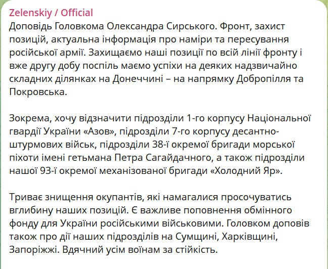 Також Зеленський повідомив, що ЗСУ другу добу поспіль мають успіхи на напрямках Добропілля та Покровська.