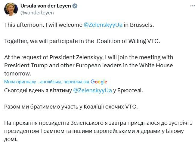 13:16 Завтра разом із Зеленським на зустріч із Трампом до Вашингтона полетять голова Єврокомісії Урсула фон дер Ляйєн, канцлер Німеччини Мерц, президент Фінляндії Стубб, прем'єр Італії Мелоні та генсек НАТО Рютте.