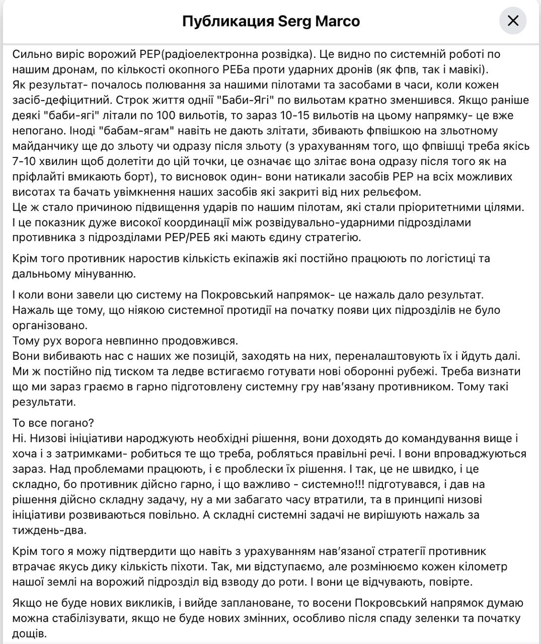 "Крім того, противник збільшив кількість екіпажів, які постійно працюють за логістикою та далеким мінуванням. І коли вони розгорнули цю систему на покровському напрямку, на жаль, це дало результат", - пише Марко.