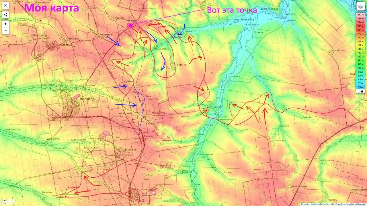 Російські військові паблики також пишуть, що в боях на схід від Добропілля ініціативу поки не змогла перехопити жодна зі сторін. За їхніми картами, росіяни утримують значні території на схід від Добропілля.