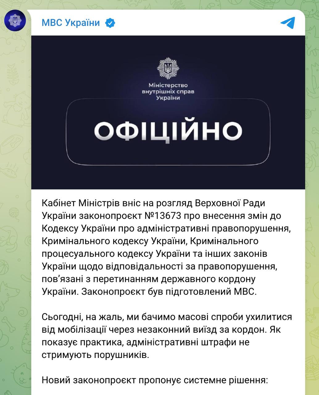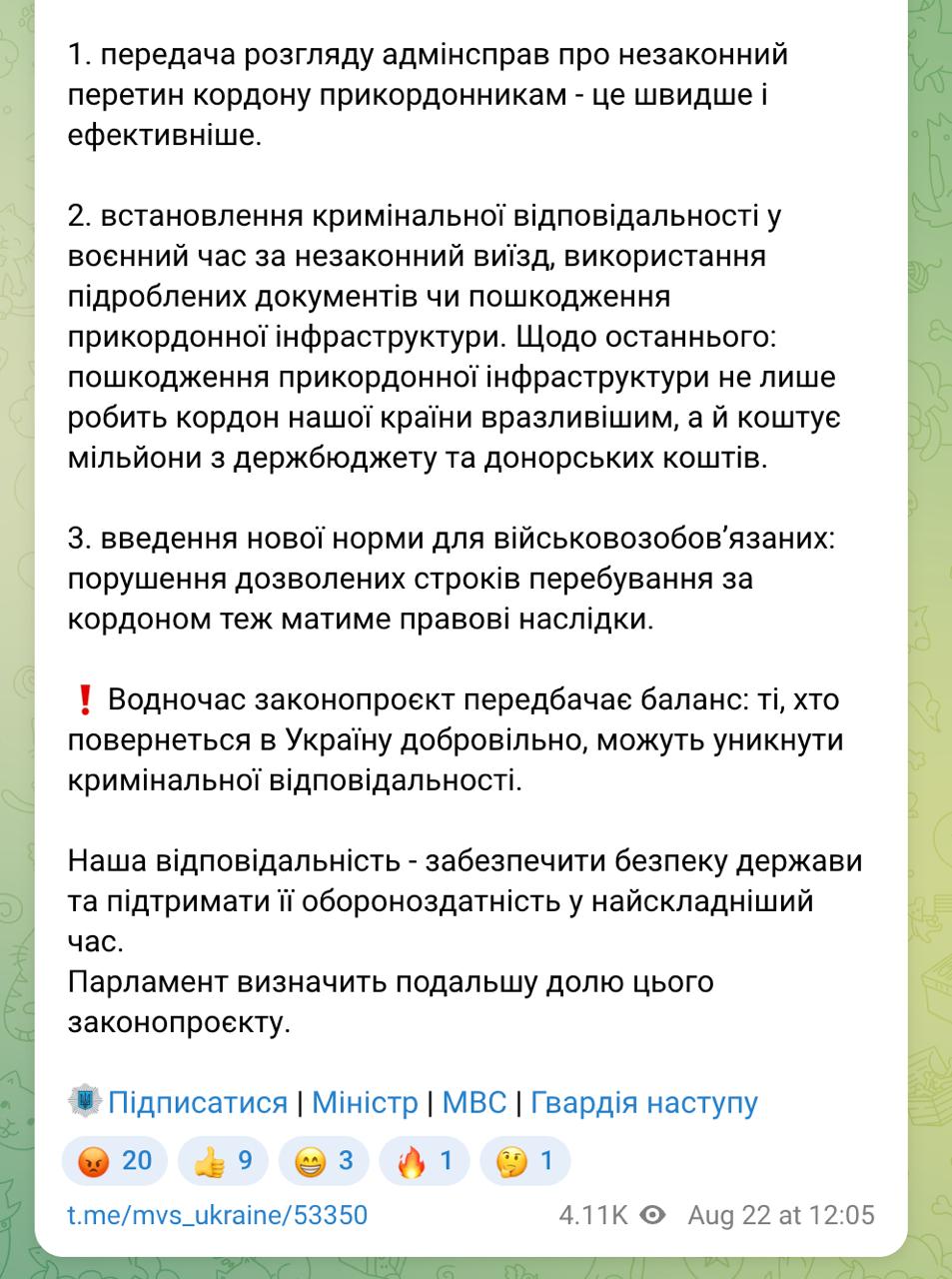 "Сьогодні, на жаль, ми бачимо масові спроби ухилитися від мобілізації через незаконний виїзд за кордон. Як показує практика, адміністративні штрафи не стримують порушників. Наша відповідальність – забезпечити безпеку держави та підтримати її обороноздатність у найскладніший час", - заявляє МВС.