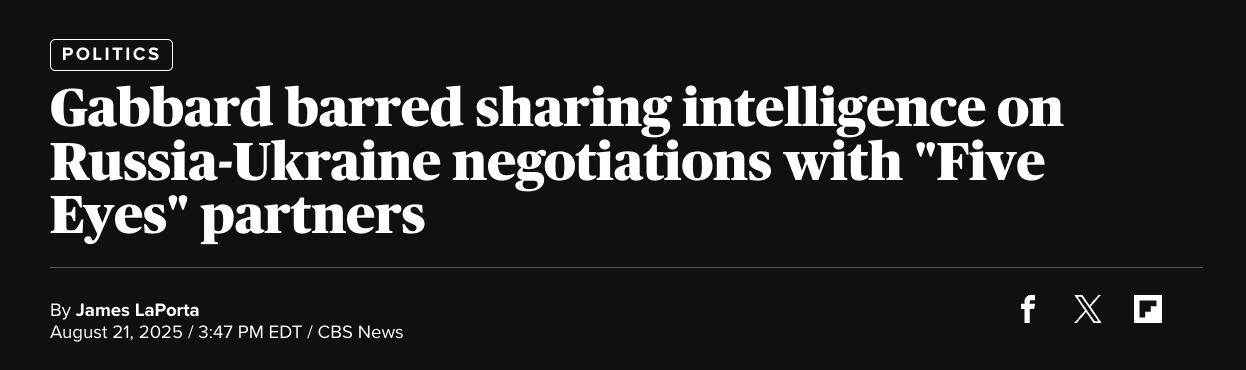 Директор національної розвідки Тулсі Габбард 20 липня видала директиву для розвідників, яка наказує, щоб уся інформація про російсько-українські переговори не передавалася партнерам США.