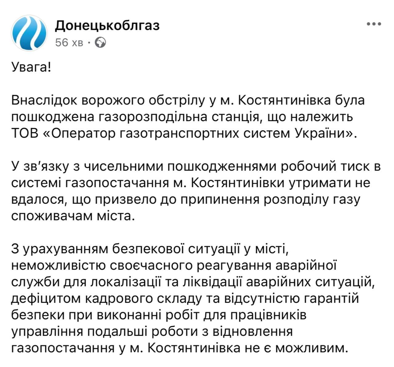12:28 Прифронтова Костянтинівка після обстрілу залишилася без газу, повідомляє Донецькоблгаз.