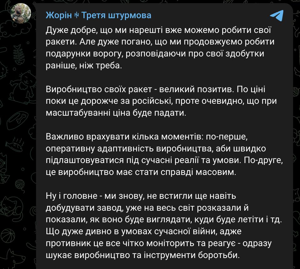 "Ми знову, ще не встигли добудувати завод, вже на весь світ розповіли і показали, як це буде виглядати, куди летітиме і таке інше. Що дуже дивно в умовах сучасної війни, адже противник все це ретельно відстежує і реагує - відразу шукає виробництво та інструменти для протидії", - написав представник 3-ї.