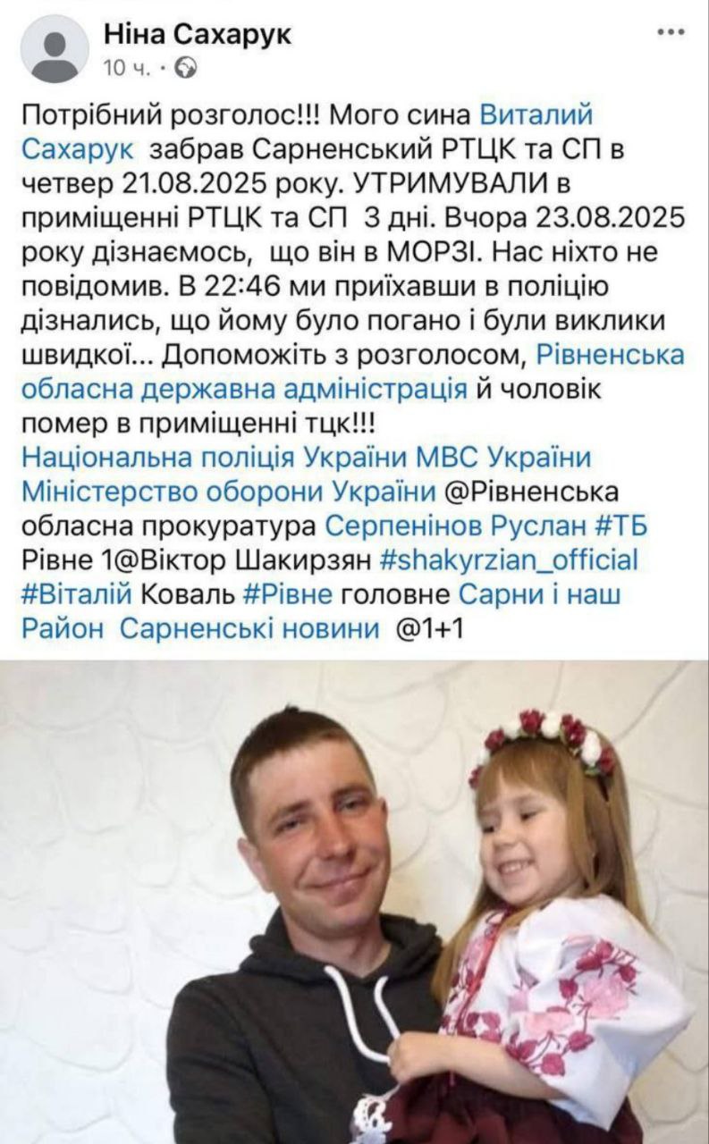 На Рівненщині помер чоловік на ім'я Віталій Сахарук, якого утримували в Сарненському РТЦК та СП.