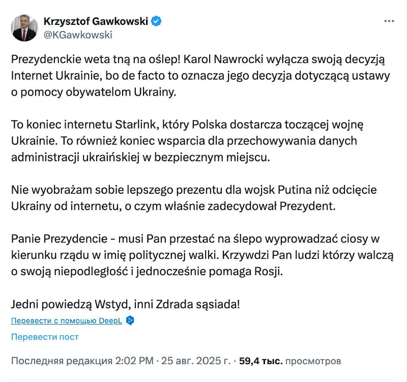 "Кароль Навроцький своїм рішенням відключає інтернет в Україні, тому що де-факто це означає його рішення щодо закону про допомогу громадянам України. Це кінець інтернету Starlink, який Польща надає Україні, що воює. Я не можу представити кращого подарунку для військ Путіна, ніж відключення України від інтернету", - сказано в публікації Гавковського.