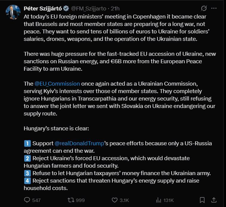 Про це заявив у соцмережі X глава МЗС Угорщини Петер Сійярто.