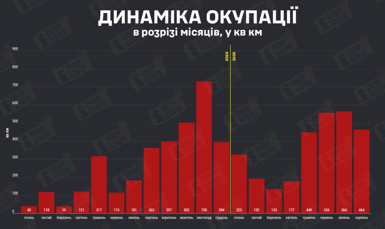 Захоплено було 464 кв км територій України, що на 18% менше, ніж у червні та липні.