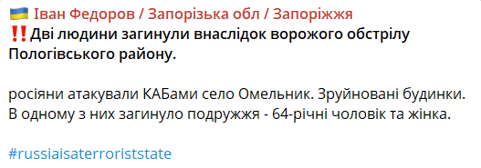 "росіяни атакували КАБами село Омельник. Зруйновано будинки. В одному з них загинуло подружжя - 64-річний чоловік і жінка", - написав він.