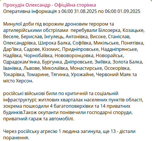 08:07 На Херсонщині через російські обстріли одна людина загинула, ще 13 - отримали поранення, повідомляє голова ОВА Олександр Прокудін.
